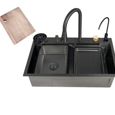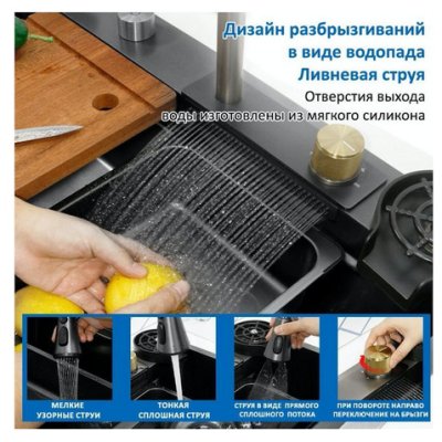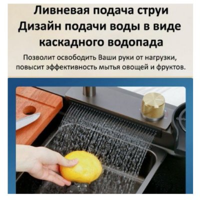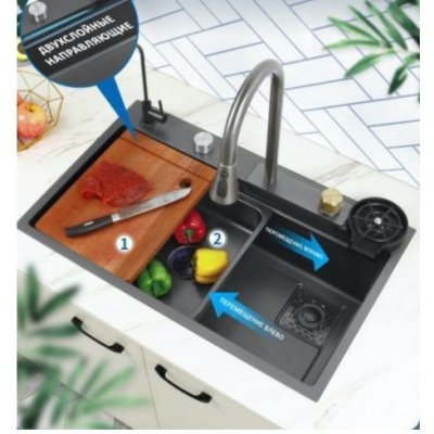 В моечной чаше имеются разноуровневые выступы, благодаря которым можно разместить аксессуары (разделочную доску, мини-мойку и наклонный коландер) для удобства использования на разных уровнях.