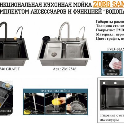 Многофункциональная кухонная мойка ZORG ZM 7546 серии MASTER GRAFIT произведена из нержавеющей стали SUS 304.