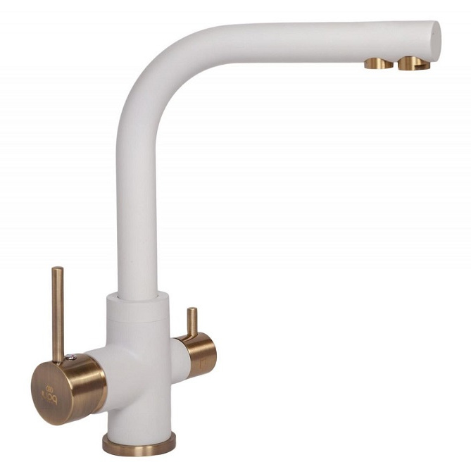 Paulmark Комбинированный смеситель Essen Es213011-431-BR белый/бронза - питьевая и водопроводная вода в одном кране. При его установке не надо вырезать в кухонной мойке или столешнице дополнительное отверстие для отдельного питьевого крана - экономия места на мойке. Высокий излив для мытья габаритной посуды, наполнения больших ёмкостей.