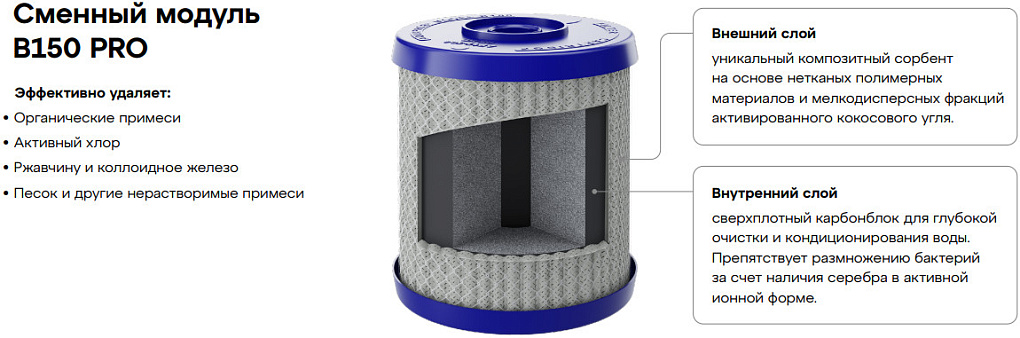 - Вторая ступень очистки: Внутренний фильтрующий слой модуля - сверхплотный карбонблок пористостью один микрон.