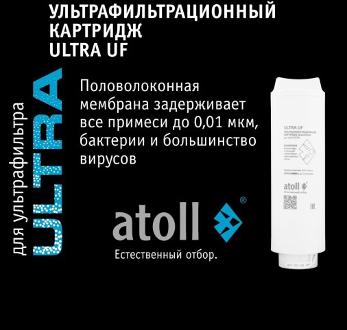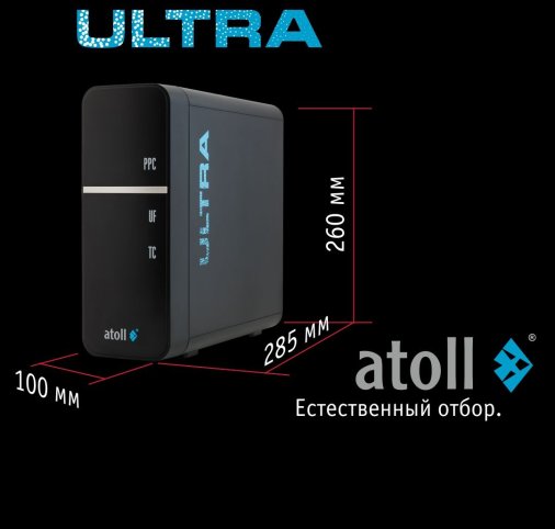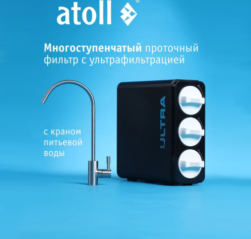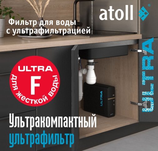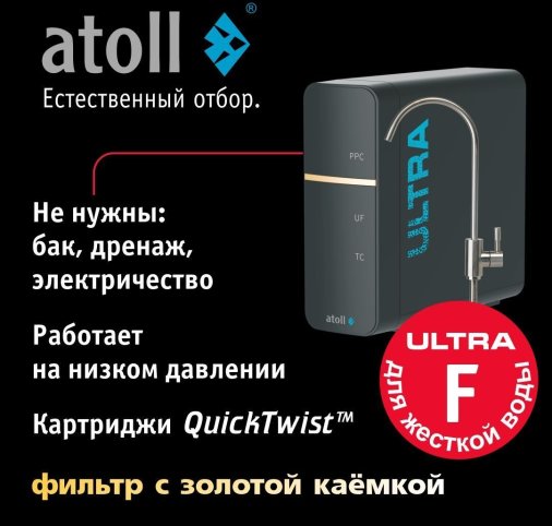 Проточная система atoll ULTRA F (для жесткой воды: до 5 мг-экв/л) имеет самую высокую степень очистки воды, возможная для бытовых проточных фильтров*.